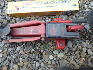 私が持っているのはフロアジャッキ(写真中央の赤いやつ)になります。自動車底部のジャッキアップポイントを明確に把握していれば、前後で両輪を上げれる機能を有していますが、私は間違ってかけて壊すのが嫌なので、底部側面のフレームについているジャッキアップポイントで片輪ずつ上げ下げしています。