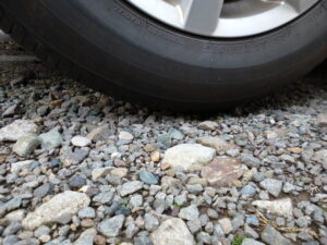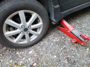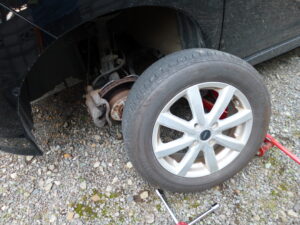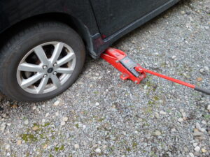 フロアジャッキを操作して車体を浮かせます。この時、フロアジャッキの足場が不安定だと安全な状態とは言えないので、フロアジャッキの足場もシッカリと確認してください。私のこの場合、家前の小スペースしか作業場所がなく、やむなく砂利の上で行っていますが、砂利の上では飛び石する危険もあるので、フロアジャッキの下にゴムマットやコンパネなど敷いた方が良かったかもしれません。次回以降注意します。