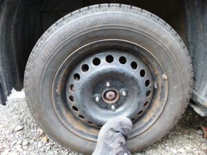 これまでの画像でお気づきでしょうが、私の冬タイヤは鉄チンホイール(スチールホイール)なので、空気圧調整後、ホイールカバーを嵌め作業終了です。使用した工具、交換したのタイヤを片付けて作業終了です。お疲れさまでした。