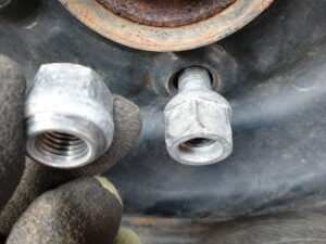 ホイールナットには、取り付ける向きがあります。上下を間違ってもレンチのソケットがうまくハマらないので大丈夫だとは思いますが、二度手間は無駄な作業となるので、あらかじめ間違いなく取り付けるのがベストです。フリードでは写真のとおり、ホイールの穴にナットの底面部がフィットする形状になっているので、ご自身のホイールナットを確認してみてください。