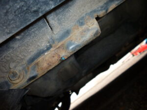 交換するタイヤ付近の床面を覗いてみるとジャッキアップポイントが分かります。私が乗っているフリードの場合、4輪とも写真のような突出部がありました。私の知識では、フレーム部分に”2か所の切り欠き”があるものと認識していましたが、今のこの車では違ったようです。最初、確証はなかったのですが、実際にジャッキアップできたのであっていると思います。