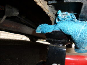 写真はフロアジャッキをジャッキアップポイントにかけている状態になります。本来であれば、フロアジャッキの受け皿を”ジャッキアップポイント用の専用アダプタ”に交換するのですが、私はそのアダプタを簡単に紛失してしまったので、代用として受け皿に雑巾をかましてジャッキアップポイントにあてがっています。