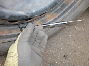 ナットの本締めが完了し、完全にジャッキダウンした状態で、エアゲージにより空気圧を測定します。既定値は運転席側のドアを開いたところに貼ってあるシールに明記されているはずです。私が乗っているフリードの場合、シールには「220(kPa)」と書いてありました。