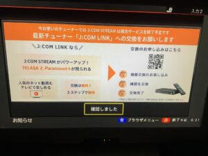 なにかというと「現在使用しているチューナーのサポートが終了するので、ジェイコムに連絡して新しいチューナーに変えてください」というものでした。正直、何が何だか状況がよく理解できなかったので、画面のQRコードを読み込んで機器更新の申し込みを行うことにしたのですが、そこですったもんだ…タイトルにも書いてしまったのですが、今回の対応でジェイコムもなんだかちょっぴり不親切だよなって思うことがいくつかあったので、ちょっと書き留めておきたいなと思いました。